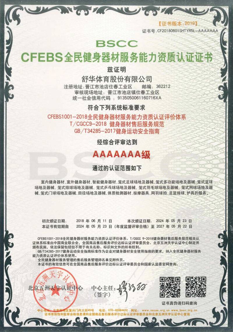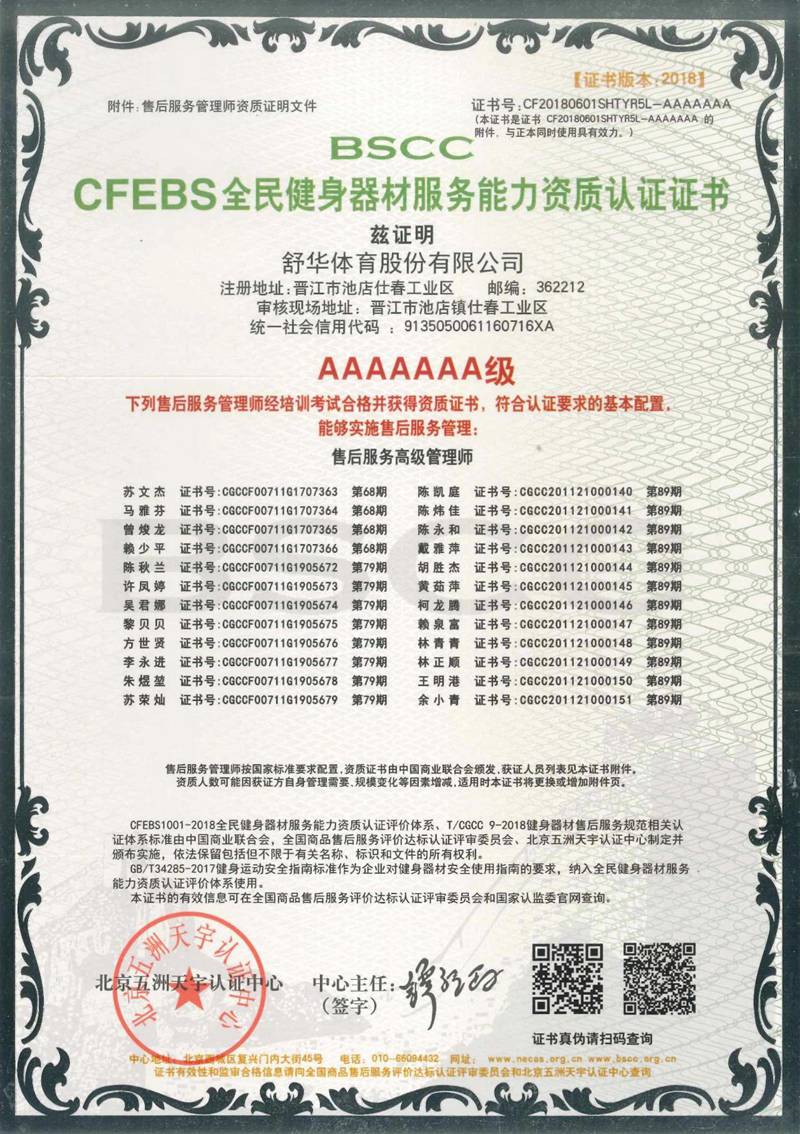 南宫NG28以用户满意作为服务追求,凭借专业的技术能力及服务保障能力、有效的售后服务体系,获得“BSCC-CFEBS 全民健身器材服务能力资质认证证书 AAAAAAA 级”,部分员工经培训考试合格并获得“BSCC-CFEBS 全民健身器材服务能力资质认证证书-售后服务高级管理师(AAAAAA 级)。